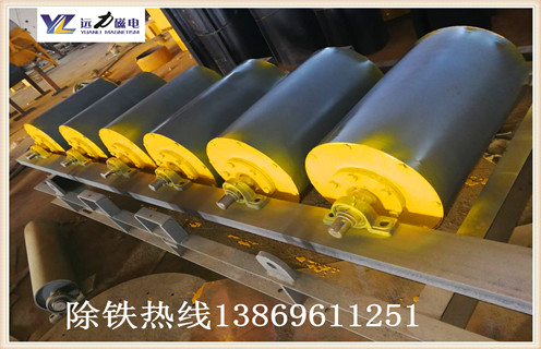 相當(dāng)于把干式弱磁滾筒裝在皮帶運(yùn)輸機(jī)上代替頭輪,或者說在皮帶機(jī)頭輪內(nèi)裝上磁系。磁系包角為360度。主要由:磁系、滾筒、磁軛、鋁環(huán)、皮帶組成。