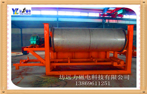 非磁性有色金屬材料在重力作用下落在磁性材料的外面.這些材料隨著筒體的旋轉,非磁性材料在重力作用下從氣缸下落,在滑槽中.含鐵磁性材料吸附在圓筒的表面上并繼續(xù)旋轉,直到其不具有磁力.材料從帶式輸送機排出,并最終分成含鐵材料和無鐵材料.